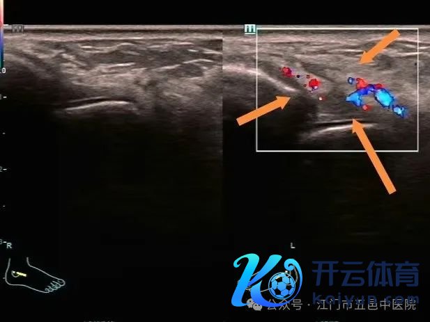 ▲跟腱增粗回声欠均已,CDFI清晰血流信号增多,跟腱后方脂肪垫水肿。